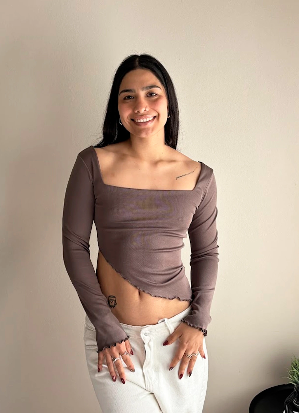 Camiseta Morley Mariana, suave y canchera. Tiene un detalle en caída en punta que estiliza y suma onda a cualquier look.